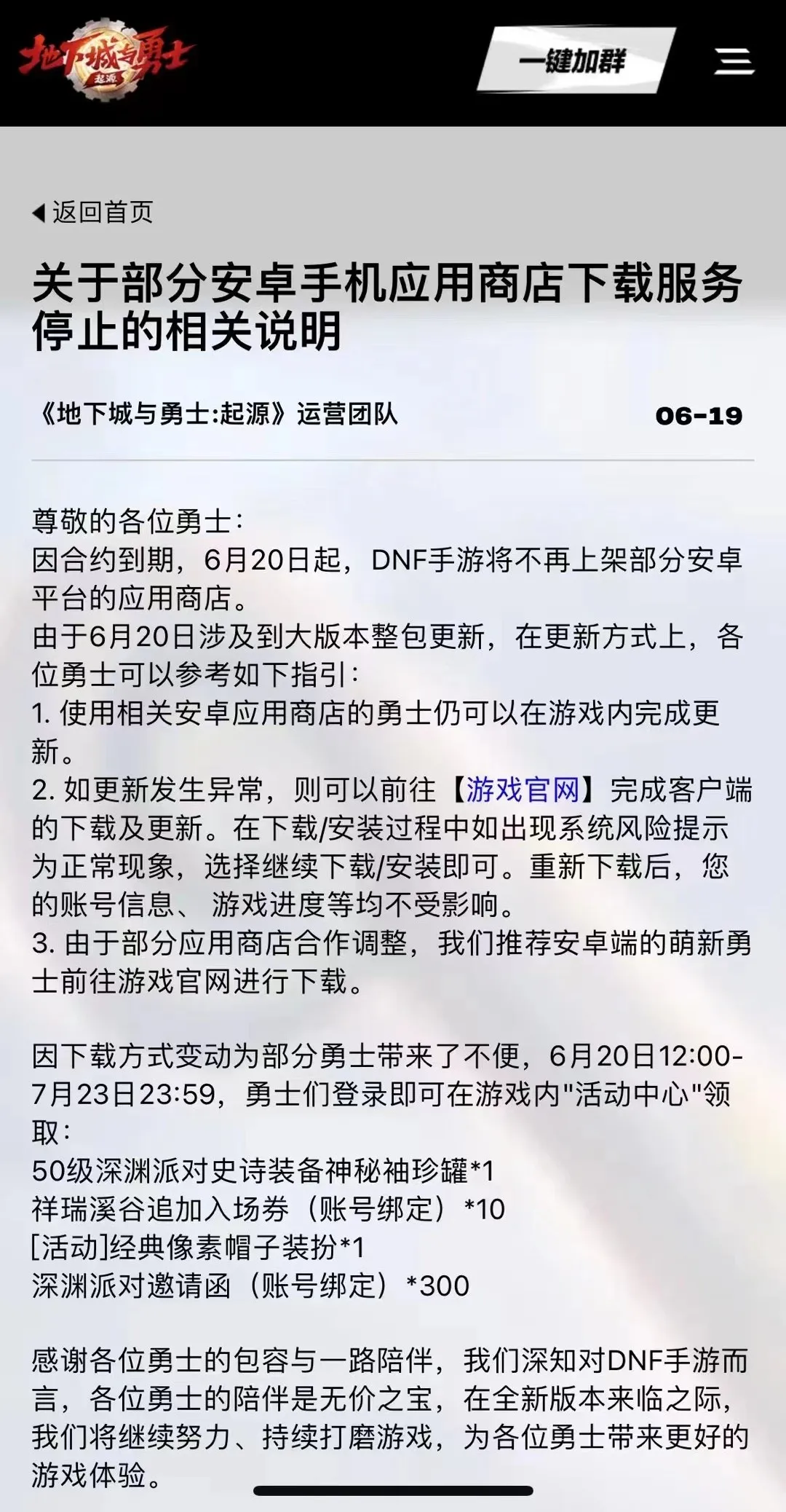 該聲明表示:因合約到期,6月20日起,DNF手遊將不再上架部分安卓平台的應用商店,過去使用相關安卓應用商店的玩家可直接在遊戲內更新。而擁有重新下載客户端需求的安卓玩家/萌新,推薦前往遊戲官網進行下載。