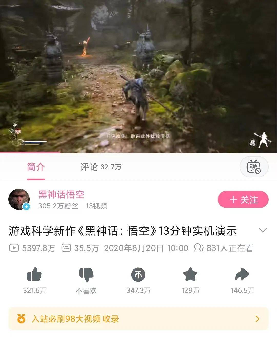 2020年8月20日,《黑神話》的遊戲演示視頻在B站爆火,至今播放量已經近5400萬。隨時打開該視頻,都有上百人正在觀看。