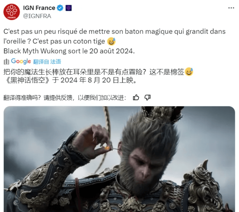 同樣在本月,法國遊戲雜誌IGN在社交媒體上嘲諷道:“把你的金箍棒放在耳朵裏是不是有點冒險?這可不是棉籤。”
