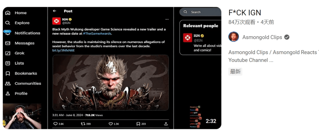 《黑神話》被外媒抨擊後,前幾天一名海外博主在YouTube上發了一個聲討IGN的視頻。一個簡單粗暴的“FxCK IGN”的標題,收穫80多萬播放量。