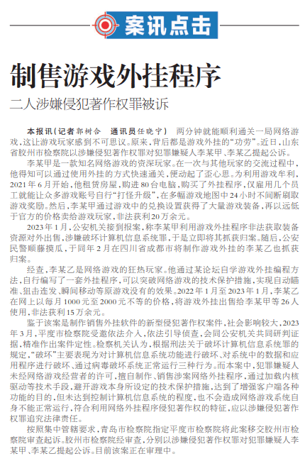 這起案件有兩名主犯,李某乙是外掛作者,通過制、售《穿越火線》外掛獲利,李某甲則是打金工作室頭目,利用外掛自動刷圖打金。