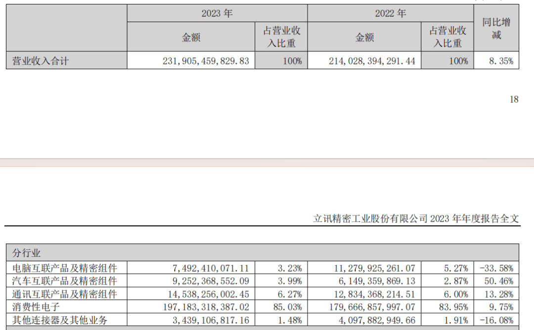 據2023年年報,立訊精密實現收入2319億元,較上年同期增長8.35%。立訊精密主營消費電子業務、通訊與數據中心業務、汽車業務、醫療業務四大板塊業務,其中消費電子業務實現營收1971.8億元,營收佔比85.03%。通訊互聯產品及精密組件共實現營收145.4億元,營收佔比6.27%,營收金額同比增長13.28%,也是除消費電子業務外,營收佔比最大的業務板塊。