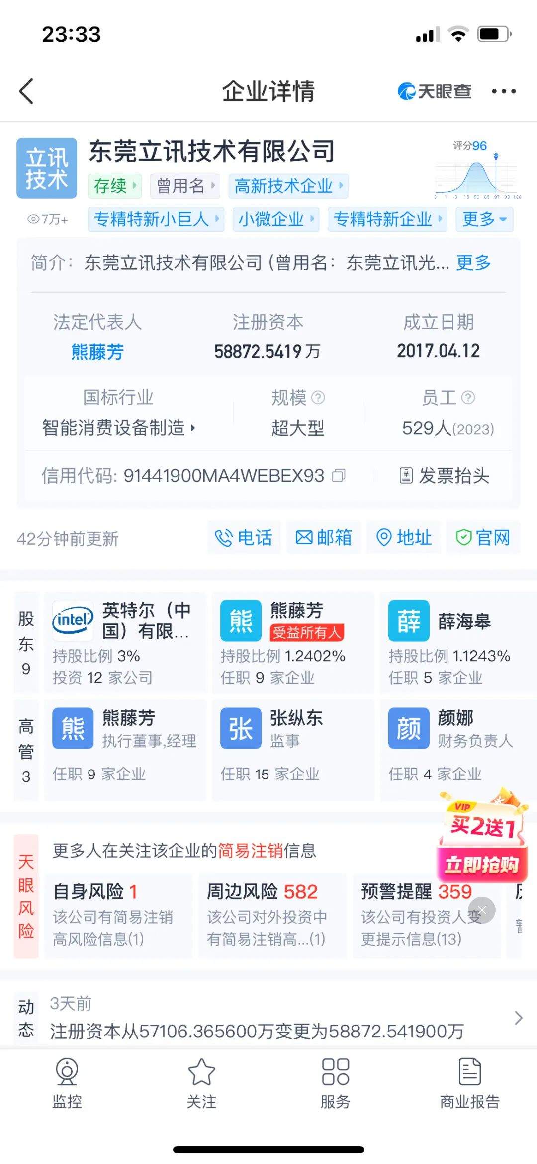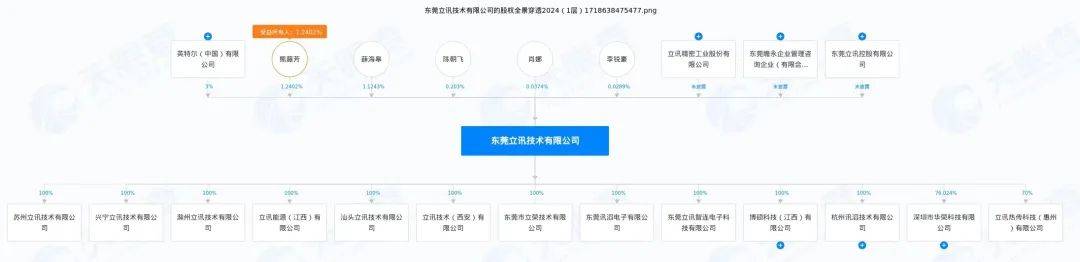 6月17日晚,天眼查信息顯示,英特爾最新入股立訊精密旗下東莞立訊技術有限公司(下稱“立訊技術”)。