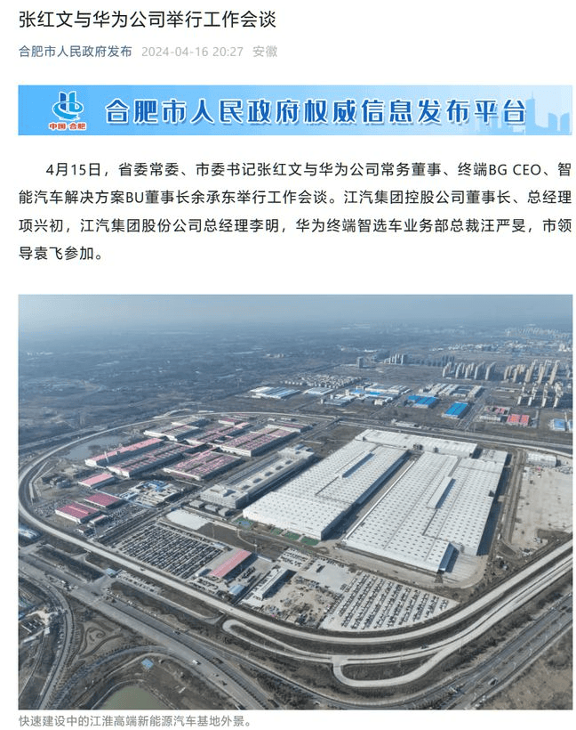 2024年4月,餘承東會見了合肥市委書記,有網友發現,相關新聞報道中出現了兩張照片——“快速建設中的江淮高端新能源汽車基地外 / 內景”。