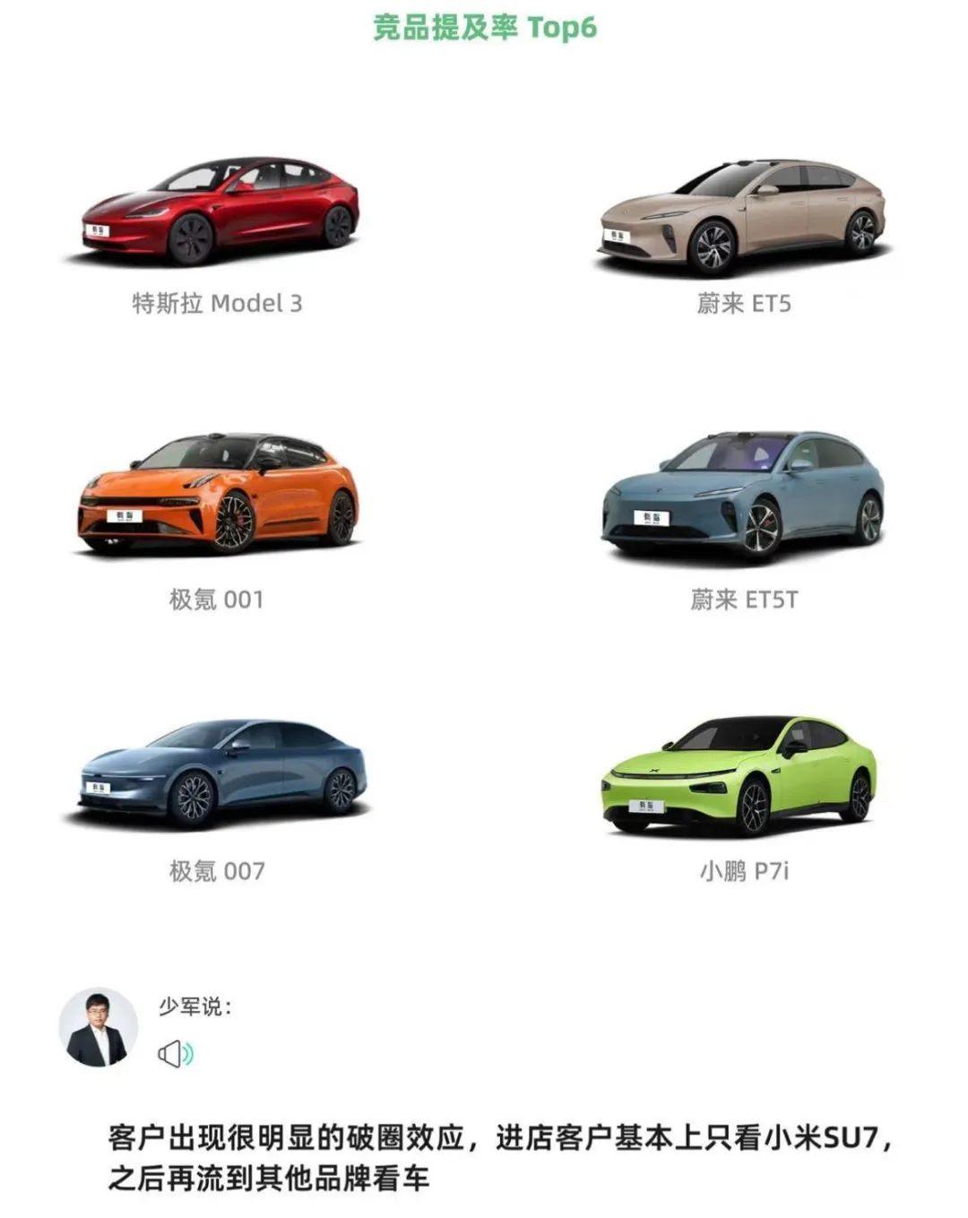 而看起來並不是小米SU7直接競對的蔚來,相比起小鵬似乎接到了一波SU7的流量。根據車fans主理人孫少軍微博發佈的小米SU7上市72小時一線快報,小米SU7的消費者形成了“破圈效應”進店看了SU7之後也會分流到其他品牌去看其他車型,這其中蔚來ET5和ET5T就是對標車型中最經常被提及的兩個。