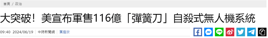 台灣中時新聞網19日稱,根據台灣軍方的通報,美國政府於當地時間18日批准向台灣出售總額3. 602億美元的“攻擊無人機導彈系統”,包含人員殺傷及反裝甲兩大類無人機。其中包括720架“彈簧刀300”型巡飛彈與101套SB300射控系統,價值約6020萬美元;以及291套“阿特斯”(ALTIUS)600M-V無人機系統,價值約3億美元。報道稱,台“國防部”早在去年就編列機密預算,以軍售方式向美採購這這些無人機系統,將主要裝備台陸軍特戰部隊與台海軍陸戰隊。