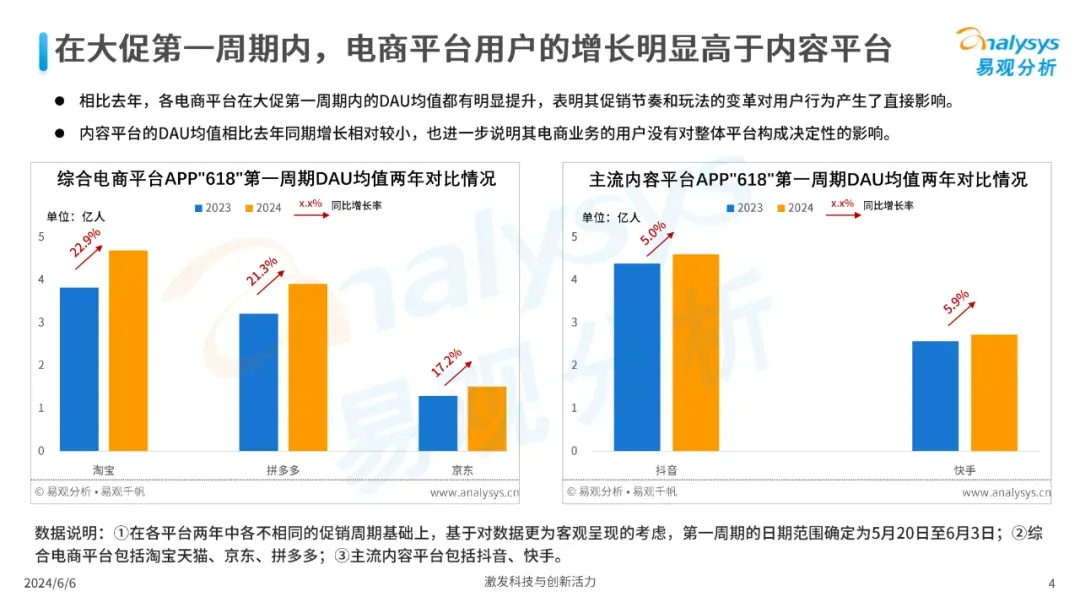 根據易觀數據發佈的《2024年618第一週期觀察》則顯示,今年618第一週期,以淘寶、京東、拼多多為主的綜合性傳統電商平台,在大促期間的用户活躍度和用户DAU增速都優於以抖音為主的內容電商平台。