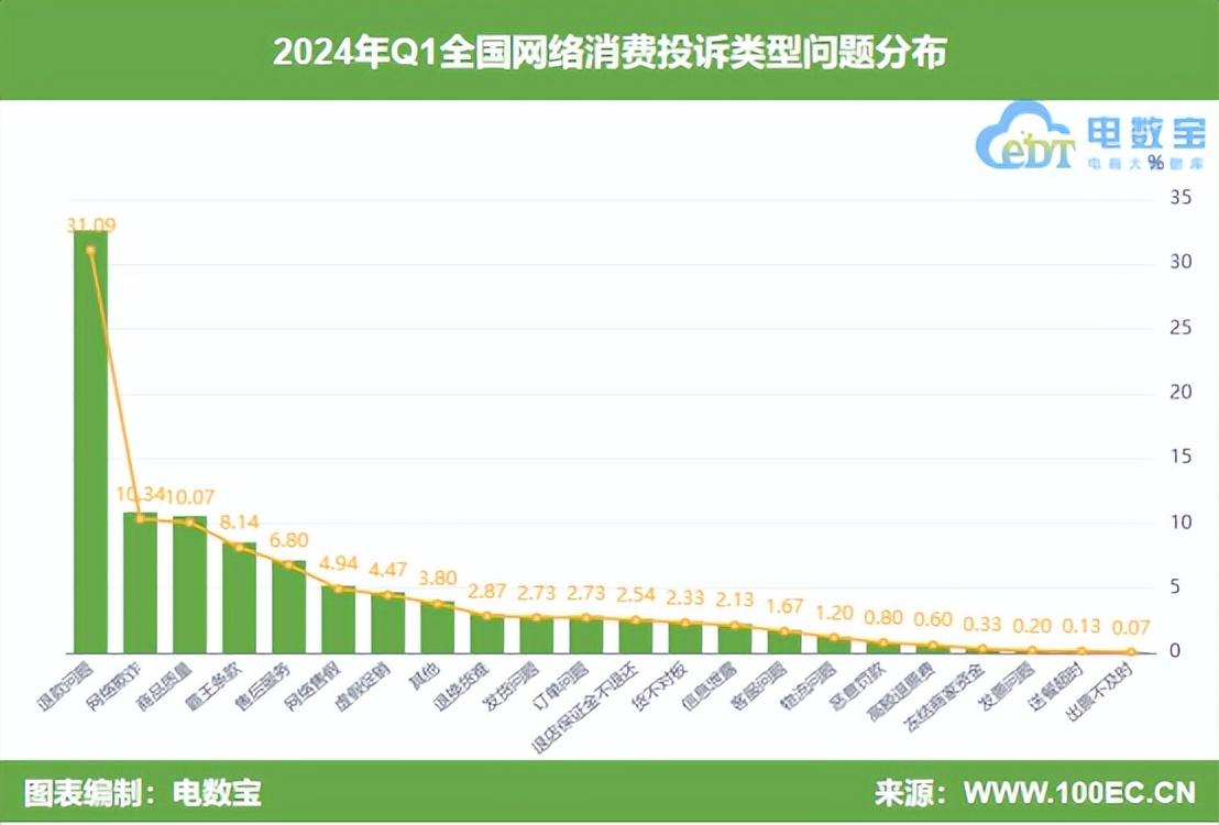 消費者為何會如此重視售後體驗?據網經社電子商務研究中心發佈的《2024年Q1中國電子商務用户體驗與投訴數據報告》顯示,在一季度全國網絡消費投訴問題類型TOP10中,退款問題排在首位,佔比達到31.09%。可見,眾多消費糾紛均圍繞着退款。
