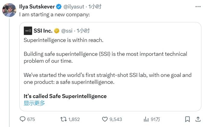 而令人在意的是,在SSI公司發佈的首個公告中,第一句話就是“超級智能已經近在咫尺”。