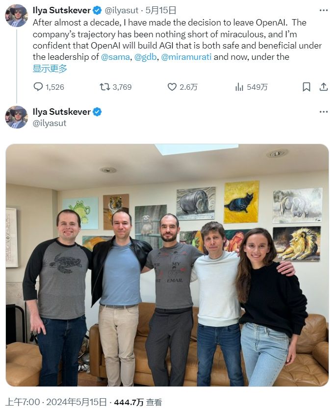雖然理念不同,但雙方私下裏依然維持着尚可的關係。在今年5月15日宣佈離開工作十年的OpenAI之時,蘇茨克維也發佈了一張管理層的合照,並表示相信在奧爾特曼等人的帶領下,OpenAI將構建出安全又有益的AGI(通用人工智能)。