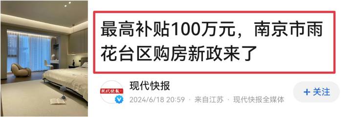 6月18日,江蘇南京市雨花台區發佈購房補貼新政。針對在該區購買新建商品住房的市民,將給予財政貼息和購房補貼,最高貼息4萬元/年、最高補貼100萬元。