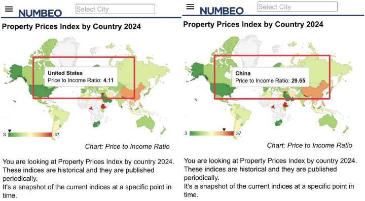 另據知名研究機構Numbeo發佈的《2024年各國房地產價格指數》,美國是4.11,中國是29.65。