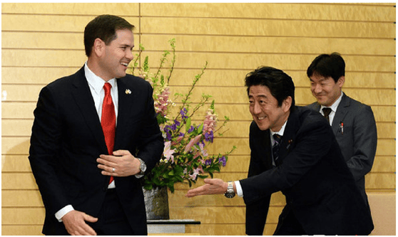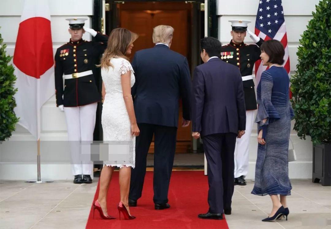 日本政客訪問美國的時候,只敢挨着紅毯的邊邊。