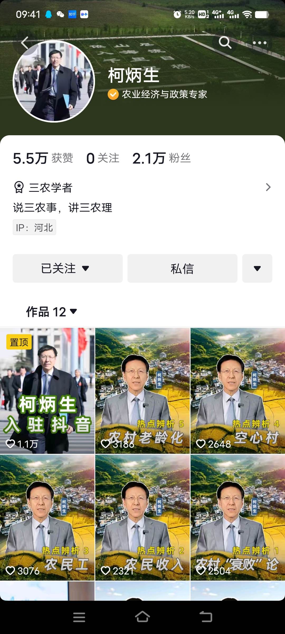 柯炳生,前中國農業大學校長,這位仍朝氣勃發的不老的老先生,最近開抖音賬號了。“説三農事,講三農理”,這是一位三農學者。説實話,作為一個返鄉創業近七年的村幹部,對此非常高興。農業、農村、農民,這農村的事啊,關注關心的人太少了,能有一個如此重量級身份的專家學者旗幟鮮明的宣講涉農問題,這是一件大好事啊。