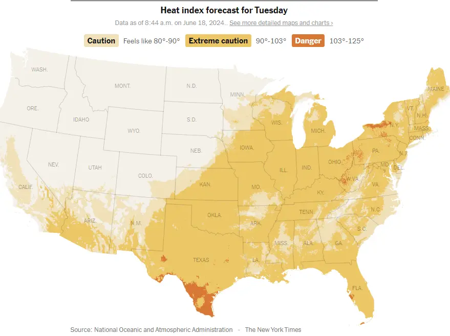 週二,全美至少有11個城市的最高氣温都打破或持平了歷史紀錄,氣温高於平均水平10到25華氏度,飆升至90度以上,甚至100多度。國家氣象局表示,高温指數預計將“在許多地方達到100至105華氏度的峯值”。
