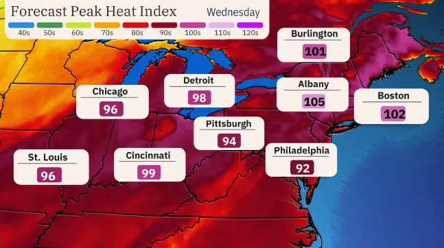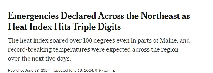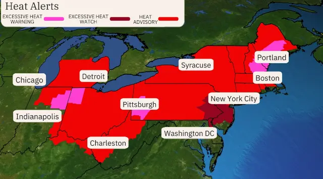 康州、麻州、新澤西州、紐約州、新罕布什爾州和俄亥俄州的極端高温,甚至引發了空氣質量警報。哈特福德、克利夫蘭、底特律、匹茲堡等大城市,氣温都可能打破歷史紀錄。