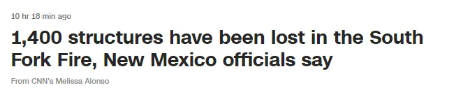當地官員在一份最新報告中説,在新墨西哥州魯伊多索(Ruidoso)附近燃燒的南叉大火已造成約 1400 棟建築受損,約 8000 人撤離。