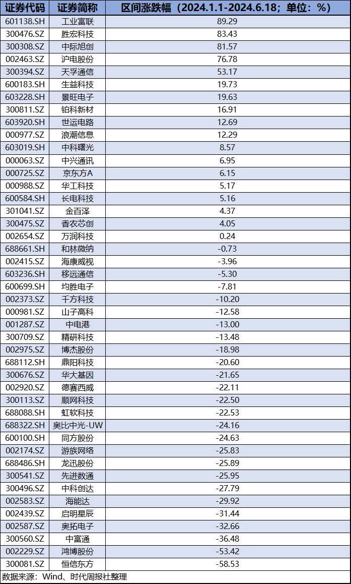 從英偉達概念股今年漲幅方面來看,截至2024年6月18日,一共有18家公司股價上漲。其中,工業富聯(601138.SH)、勝宏科技(300476.SZ)、中際旭創(300308.SZ)年內累計漲超80%,分別達到89.29%、83.43%、81.57%。