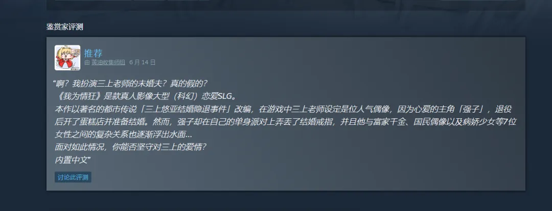 目前,真人互動影遊主要依託Steam等官方平台,相對於盜版氾濫的短劇市場,其防盜版措施更為嚴密。玩家若想體驗遊戲,必須通過正規渠道付費購買。此外,通過與Steam社區和用户的直接溝通,製作組能夠更直接地瞭解玩家需求,獲得大量用户支持,並建立起內容品牌認知。