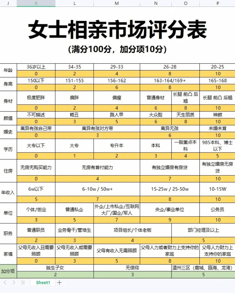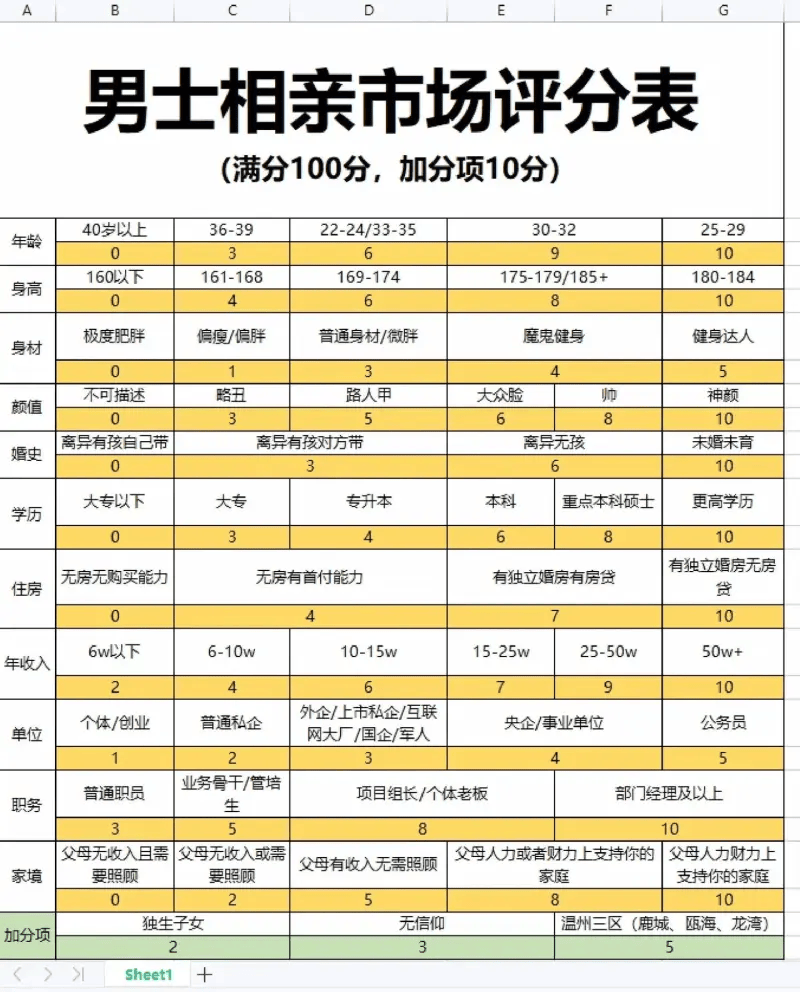 還記得之前同樣在朋友圈爆火的“男女相親市場評分表”嗎?也是從年齡、身高、身材、顏值、婚史、學歷、收到到家境都維度,事無鉅細對人進行三六九式評分。