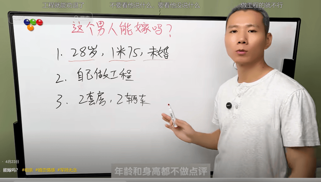 提到工程男,他還不忘給大家科普:“工程男的事業只是攤子看起來很大,實則要麼手裏沒活,要麼拿不到錢。同時,沒提到家庭情況,父母大概率沒正式工作,以後也沒有退休金。”