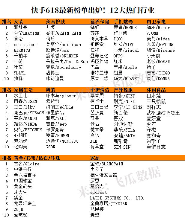 6月19日,本次快手電商618第二階段也落下帷幕,品牌商家業績再創新高。飛瓜也將從12大熱門行業出發(女裝、美容護膚、營養保健、手機數碼、廚衞家電、家居生活、男裝、個護清潔、家紡、黃金/彩寶/鑽石/珍珠、户外鞋服、休閒食品),挖掘快手618第二階段(6月1日-6月18日)熱賣品牌榜單情況。