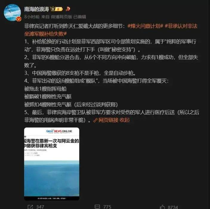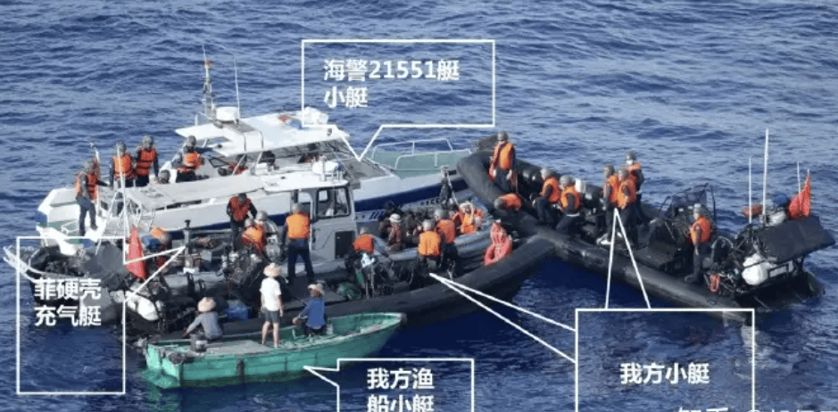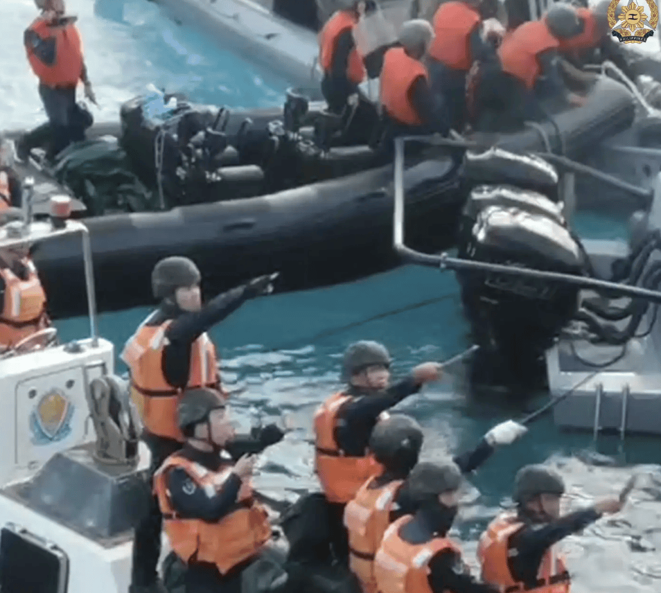為了給仁愛礁上賴着不走的破登陸艦運送補給,長期接受美國訓練的菲律賓海軍特種作戰大隊,搭乘6艘艦艇從不同方向衝撞,試圖強行突破海警的管制進入仁愛礁內…..結果被海警收拾了一頓。