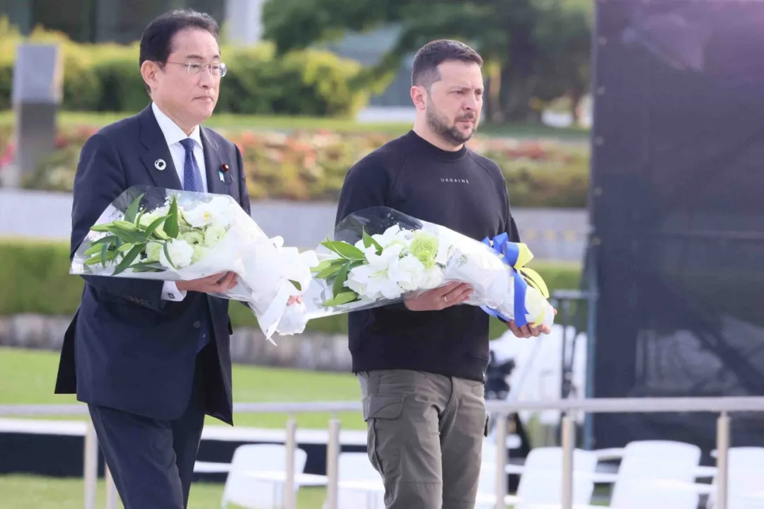 ▲當地時間2023年5月21日,日本首相岸田文雄和烏克蘭總統澤連斯基在廣島和平紀念公園的原子彈受害者紀念碑前獻花****。****