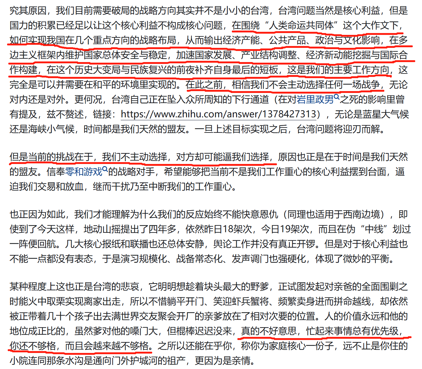 還記得四年前,當時剛越過偽“中線”,我就説這事不必太着急,火候還沒到,文字現在都還留着,這四年連編輯都不帶動的。當時就私擬了一個概念“非優先級的核心利益”。是不是關乎郭本的核心利益,那當然是。可是在郭嘉發展的進程中,總體上能控制住局面,保證該問題的性質不發生本質變化,當然阻礙力度也很大,所以控場與障礙達成了動態平衡。所以在優先級上是可以往後放放,等到實力更為強大的時候,再來謀求更為優化的解決辦法。台灣問題正是如此,所以當年我寫了這麼幾段話: