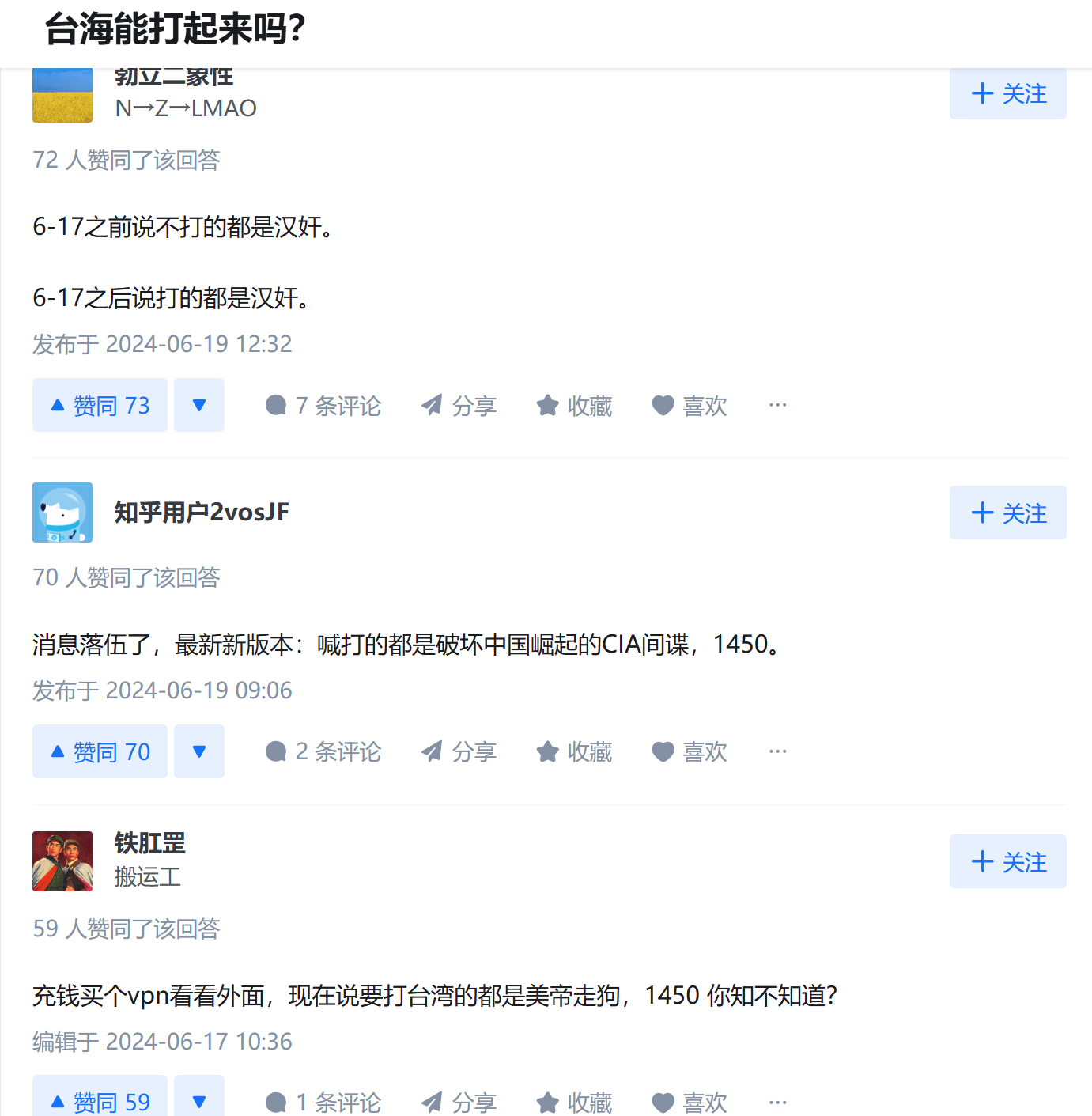 又有朋友説了,民心為本啊,你看看民調長啥樣了,再過段日子全綠化了,治理起來難啊。那很可憐,島上也就這點人,2000萬對14億,咱就退到最壞情況,全綠了又佔到多大比例呢?當年哥特人面對羅馬説小心我全民皆兵奮起反抗時候怎麼説來着:“好啊!草越密,我越好割。”更何況可能全綠嗎?當年敢於真刀真槍去反抗日本殖民統治的英雄同胞後裔,大部分不在這2000萬里。至今依然敢於喊出統一的同胞們,以及一部分以“不好説”搪塞民調的,還有口嗨説毒立,事到臨頭就要法國軍禮的,還能稀釋掉這2000萬的多少?更不用説還有這麼一大批人,真正踐行了何謂“反華是工作,登陸為生活”、“兩制我要罵,惠台我全蹭”,某些人不是最喜歡笑話這樣的中國人麼?怎麼籍貫一換就突然變成了不得的大事了呢?指望這樣的精緻利己主義者給我們展現什麼樣的“毒立”風貌呢?除了拉了一堆地域歧視的負能量,他們又能給大陸同胞造成什麼實際的損失呢?