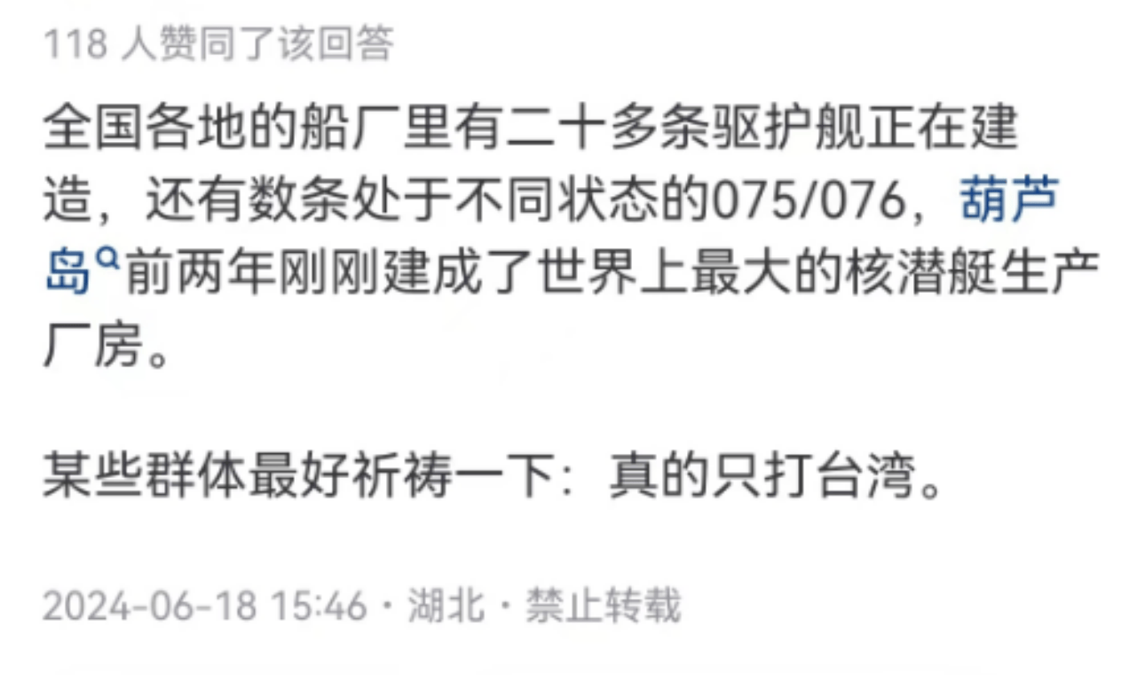 還有朋友説,着急啊,這個第一島鏈隨時鎖在我們脖子上,越往後域外國家對台灣的武裝越嚴密越完備,我們要收復的代價和鮮血也越多越大。這話有一定道理,台海走到今天這步,根本上不是台灣抵抗多激烈,而是域外多折騰。但反過來講,我們大陸不僅與台灣在此消彼長,同樣也和域外國家比也此消彼長啊。説個我的親身經歷,十幾年前釣魚島漁船事件沒多久,曾在一個活動中有機會和喬良將軍聊了幾句,他有兩段話我印象特別深,一是中國面臨的爭端其實不要老喊打打殺殺,百指柔巧實力才是真功夫,試想美國當年崛起時候怎麼樣,是不是動不動來個乾坤一擲?二是不要老鸚鵡學舌第一島鏈卡脖子,海空軍真正強大了,配套體系健全了,經濟後盾有保障了,隨時都是想出就出,到那時候鏈條一破全是孤島。如今看看又是與不是呢?何況美國賣給台灣那些裝備,作為軍迷都該有數,20年前哈喇子,10年前已經覺得釣凱子,今天一看簡直就是詐騙二桿子。出的主意也是越來越餿,從“境外決戰”到“灘頭聚殲”再到如今“豪豬戰術”,一句話:把你打爛不心疼。最近幾年的演習圖對比也能看出來,咱的包圍圈是越收越緊,它的航媽是越開越遠。就這很多被綠化洗腦的毒派分子一邊交錢收破爛一邊還要大喊“我被看見啦,野爸爸愛我”,好笑不好笑啊?