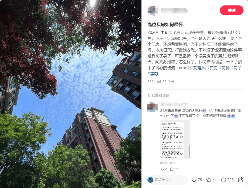 全國各地還有許許多多的王俊、周道道們。在小紅書上,很多在2019年至於2023年買房的人,分享了自己“雙高位”買房的經歷,看到房價腰斬和房貸利率持續下降,都自嘲是“大冤種”。