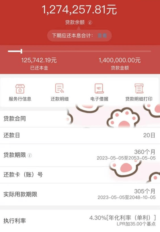 “當時首付70%,房貸利率5.35%,一個大冤種。去年10月二套轉為首套,利率降到4.65%,提前還款10萬元;今年5月合同日房貸利率調整為4.3%,打算繼續提前還款20萬元”陳懿説。她的積極“自救”,把還款總額從280.8萬元一下降到155.4萬元。