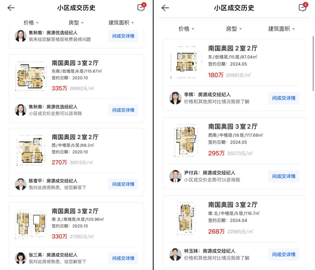 2020年5月,王俊買入南國奧園的房子時,成交價在3萬元/平米左右;而貝殼找房(02423.HK,NYSE:BEKE)app中,最新成交的一套87平米的房源,總價為180萬元。