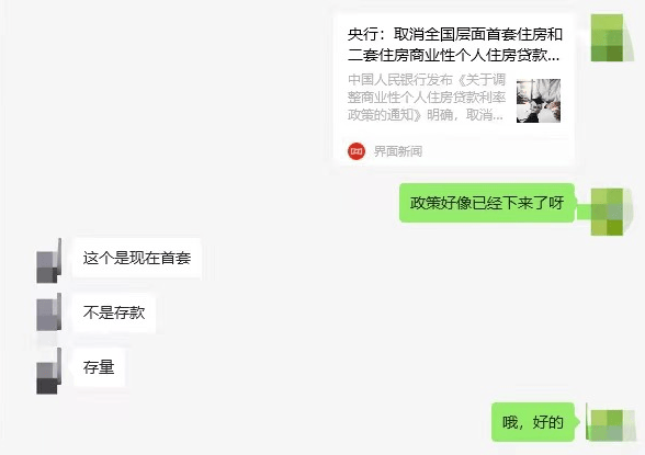 周道道也把央行取消房貸利率下限的消息轉發給了負責自己房貸的銀行經理,對方回了一句“這個是現在首套(住房),不是存量。目前(存量房貸)沒政策。”
