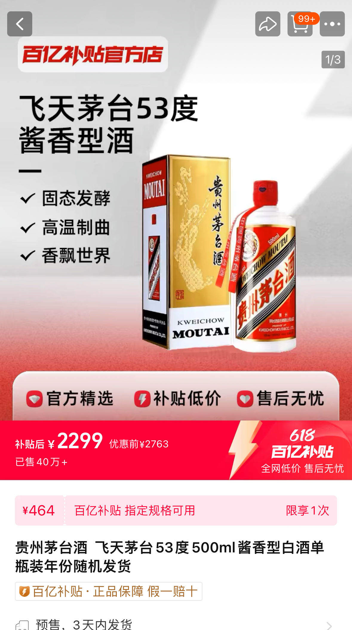 例如,天貓百億補貼推出的53度500ml飛天茅台,補貼後就只有2299元每瓶了。