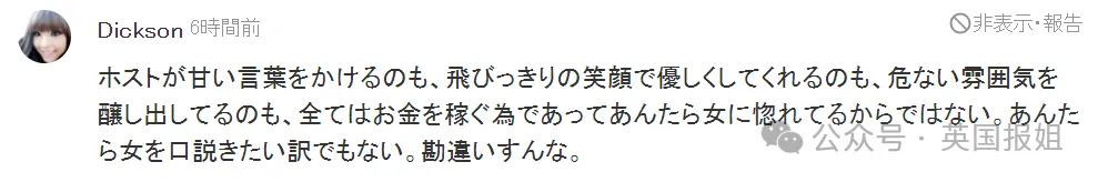 “牛郎對你的甜言蜜語,温柔微笑回應你都是故意製造氣氛,都是為了賺你的錢,絕不是因為他們喜歡你這個女人,你可別傻了。”