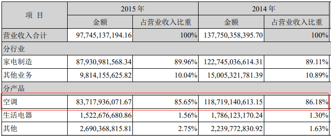 具體來看,格力引以為傲的空調業務線,營收從1187億元下滑至837億元,是導致2015年度公司總體業績下滑的主要原因。
