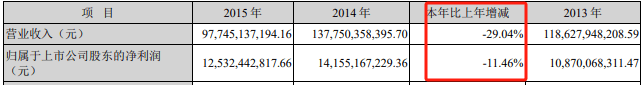 財報數據顯示,2014年時,格力的營業收入和淨利潤分別為1377.50億元、141.55億元;但是到了2015年,這兩項數據分別下滑至977.45億元、125.32億元;各自降低了29.04%、11.46%。