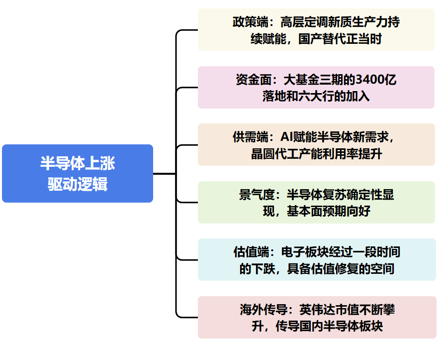 大基金三期的3400億落地大幅提振半導體板塊。看好AI賦能新需求、國產升級大趨勢以及半導體進入板塊景氣度抬升週期。