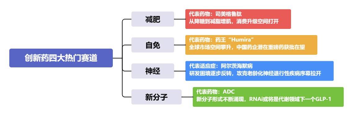 2024年全球創新藥四大最值得關注的賽道是:減肥、自免、神經、新分子。