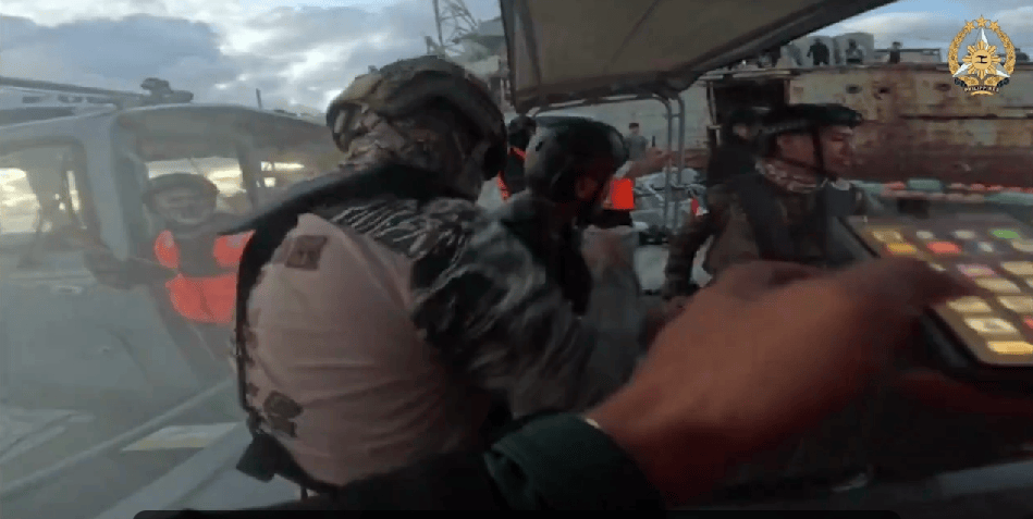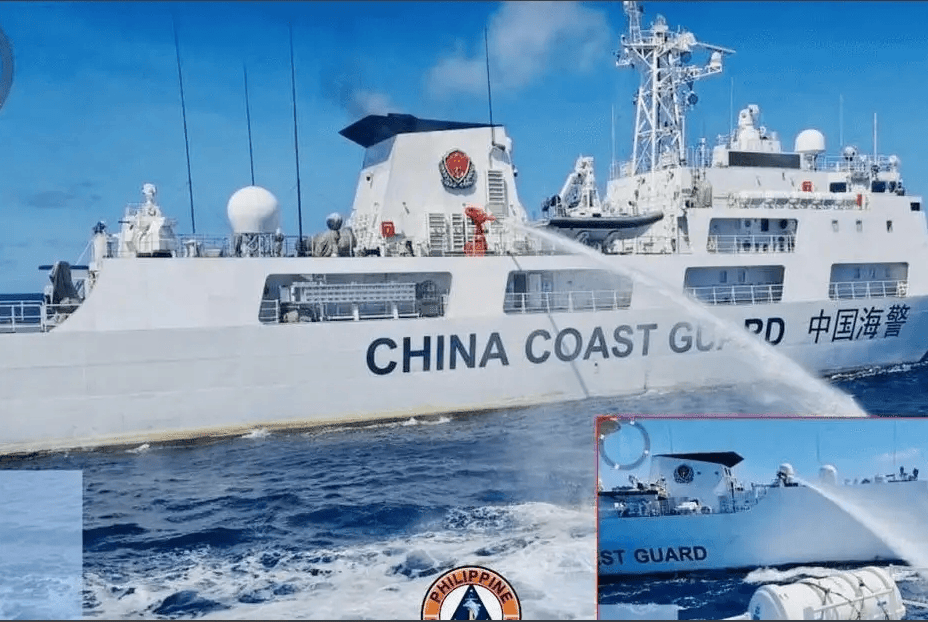 登陸艦上的菲軍守兵用潑水的方式攻擊中國海警,還居高臨下指揮其他菲軍特種兵時,中國海警疑似使用爆閃燈干擾對方。