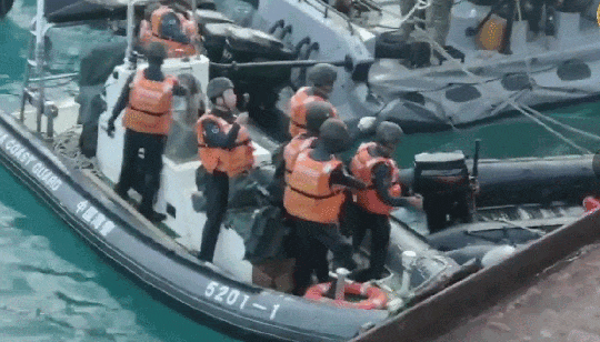 實際上這點不用擔心,雖然快艇上的海警們沒有持槍,但是在鏡頭之外,有多艘數千噸級的中國海警船時刻盯着這裏的一舉一動,他們有槍,就是口徑大了點,76毫米的。