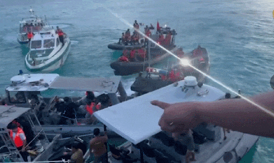 當中方人員按照計劃,開始沒收和企圖拖拽小艇時,菲方東一頭西一頭幹啥的都有、喊叫着,四處亂跑,沒有形成統一的指揮,後方擱淺登陸艦上的菲軍守兵也不斷地呼喊和打手勢,想要提醒下面的菲方人員注意中方行動。