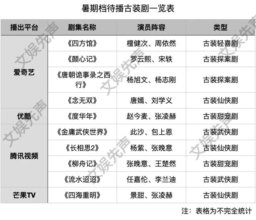 從今年暑期檔待播古裝劇來看,愛奇藝手握檀健次、周依然主演的古裝喜劇《四方館》以及羅雲熙、宋軼主演的古裝探案劇《顏心記》等,能否再現《長風渡》和《蓮花樓》的爆款盛況,有待觀察;唐嫣、劉學義主演的《念無雙》也被提上了日程,以唐嫣為代表的85花還能在古偶的舒適區通知多久,還需打上一個問號。