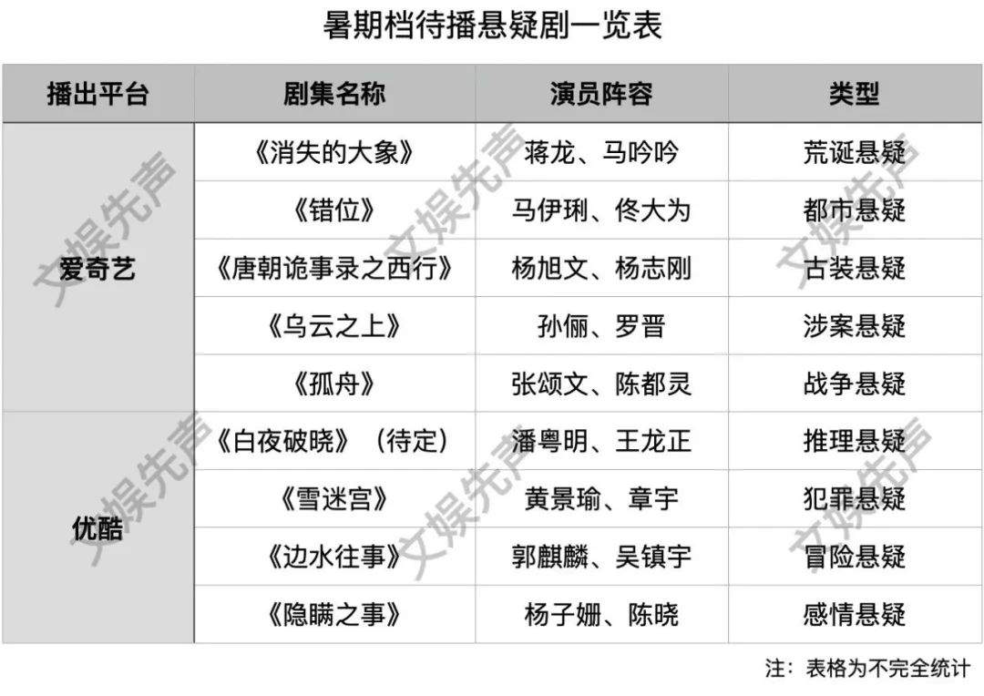 愛奇藝即將的懸疑劇類型多樣,蔣龍、馬吟吟主演的《消失的大象》定位於荒誕懸疑輕喜劇,馬伊琍、佟大為主演的《錯位》聚焦都市懸疑,楊旭文、楊志剛主演的《唐朝詭事錄之西行》主打古裝探案,孫儷、羅晉主演的《烏雲之上》鎖定涉案懸疑,張頌文、陳都靈主演的《孤舟》將上演戰爭懸疑,年代感十足。