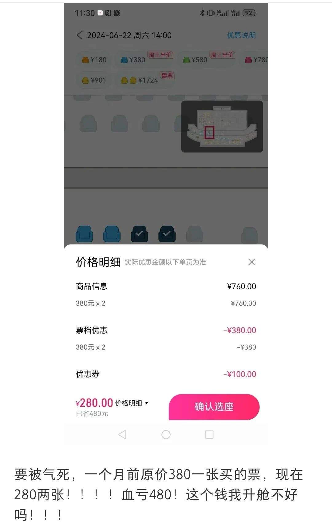 不過,打折票的出現,也令購買原價門票的樂迷頗為不滿,自認從“早鳥”變成了“冤種”,“既然如此還需要什麼開票日?不如都來等最後抄底”。值得注意的是,門票打折在如今的演出市場十分普遍,更不乏出現“巨折”門票。