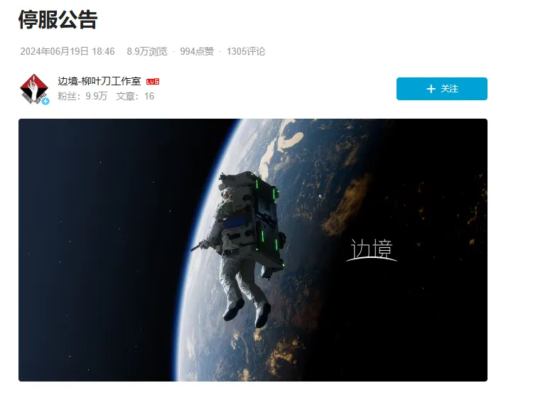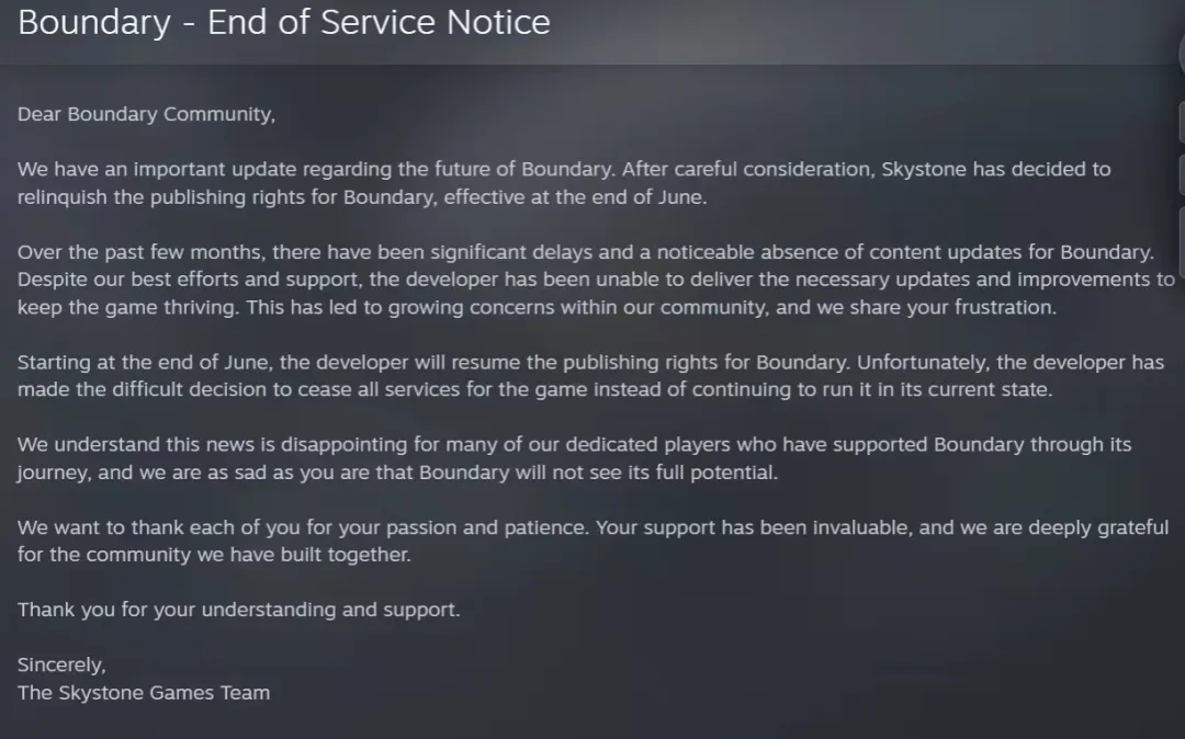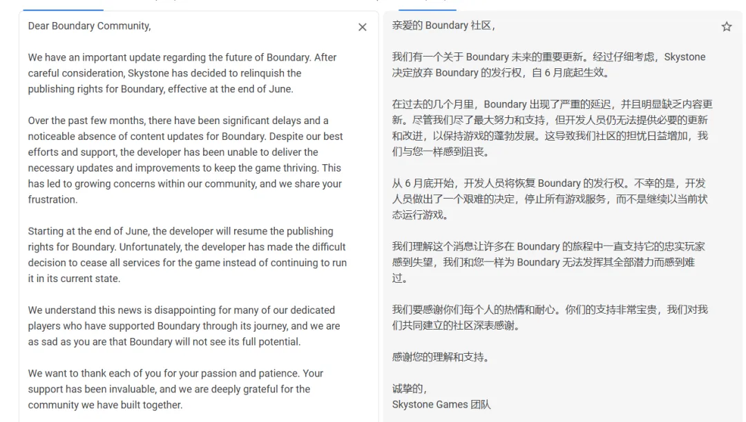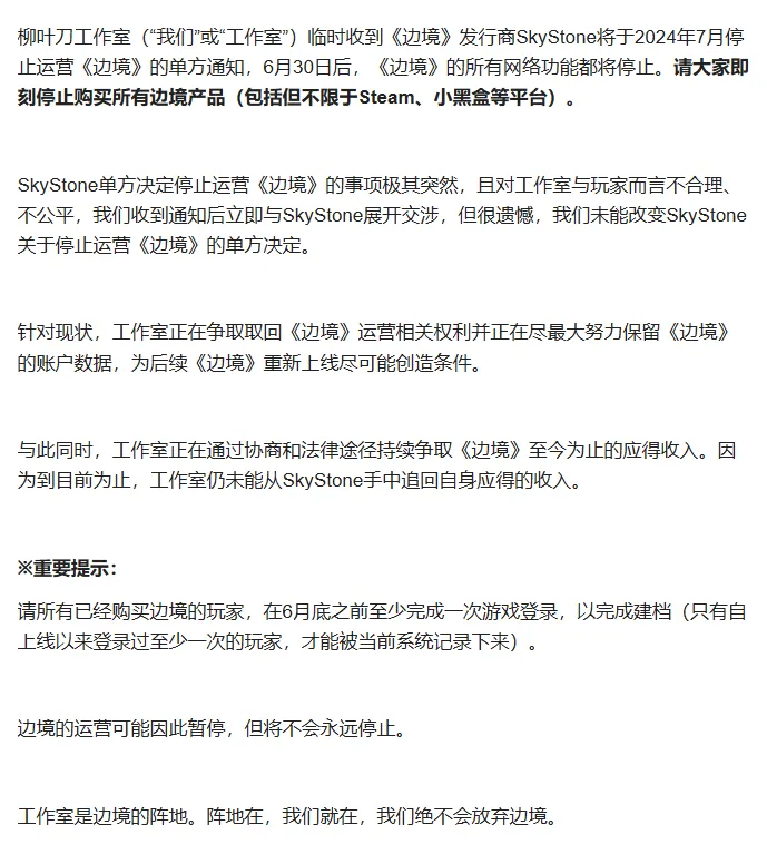 6月19日,柳葉刀官方B站賬號發了動態,表示《邊境》將於今年7月停服,停服是發行商SkyStone的單方面要求,且SkyStone方面欠錢了。