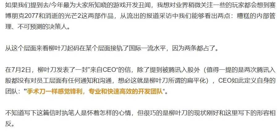 2021年的時候,柳葉刀工作室前員工“哥布林機車”在微博上爆料,稱柳葉刀工作是內部管理糟糕、決策人不可預測,導致從成立開始到21年六年間沒有任何的項目產出。