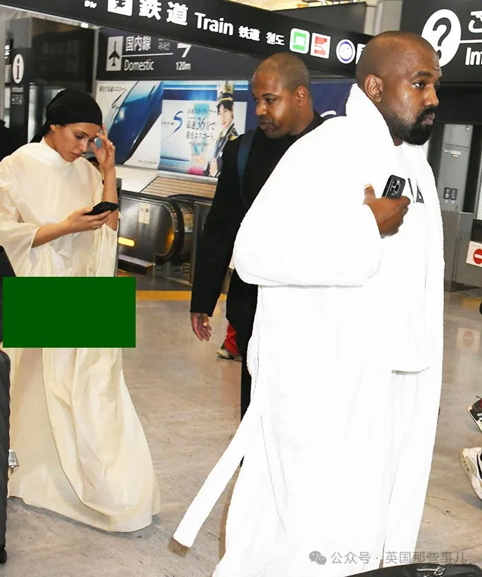 剛下飛機時造型還挺保守,侃爺被白色長袍裹住全身,比安卡也罩着一件半透明的外套,好歹能遮着點。